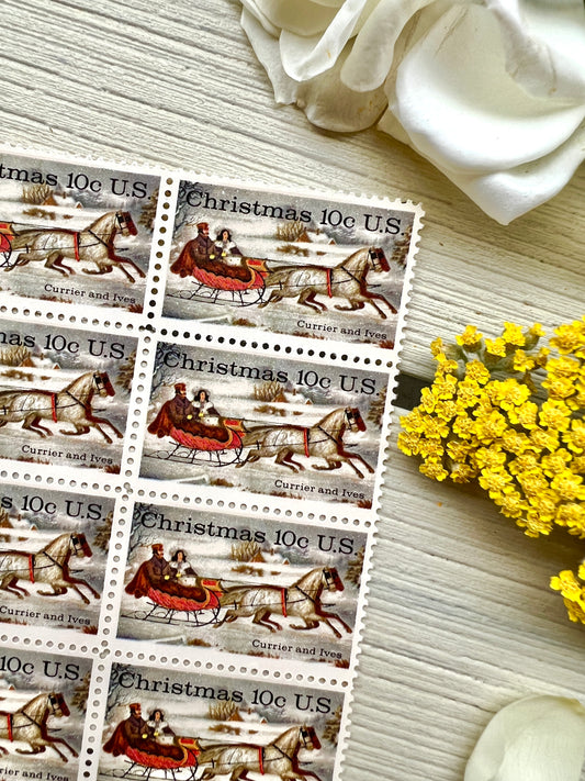 12 Sleigh & Horse Christmas Stamps - Vintage Currier & Ives Holiday Stamps for Mailing from 1974
