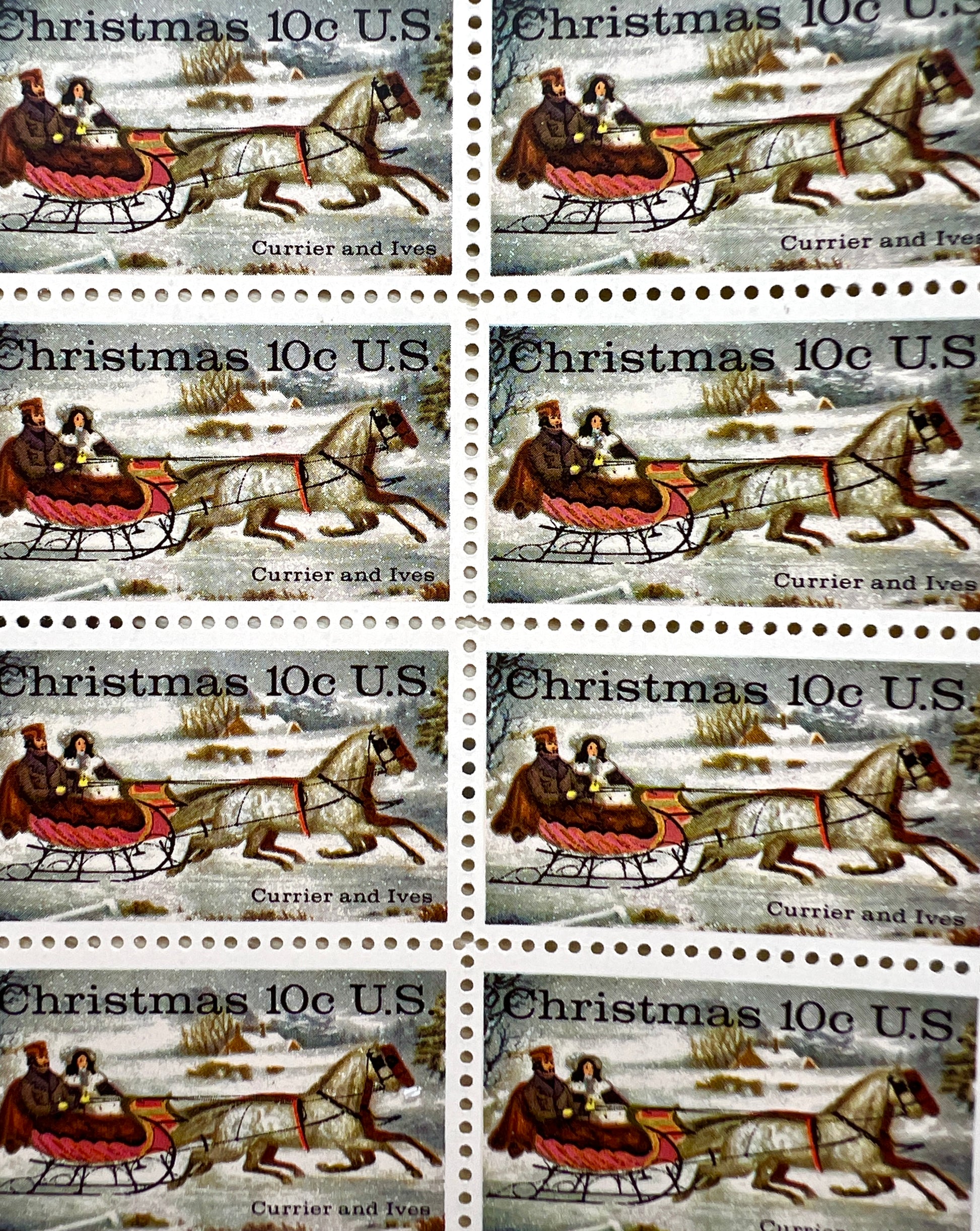 12 Sleigh & Horse Christmas Stamps - Vintage Currier & Ives Holiday Stamps for Mailing from 1974