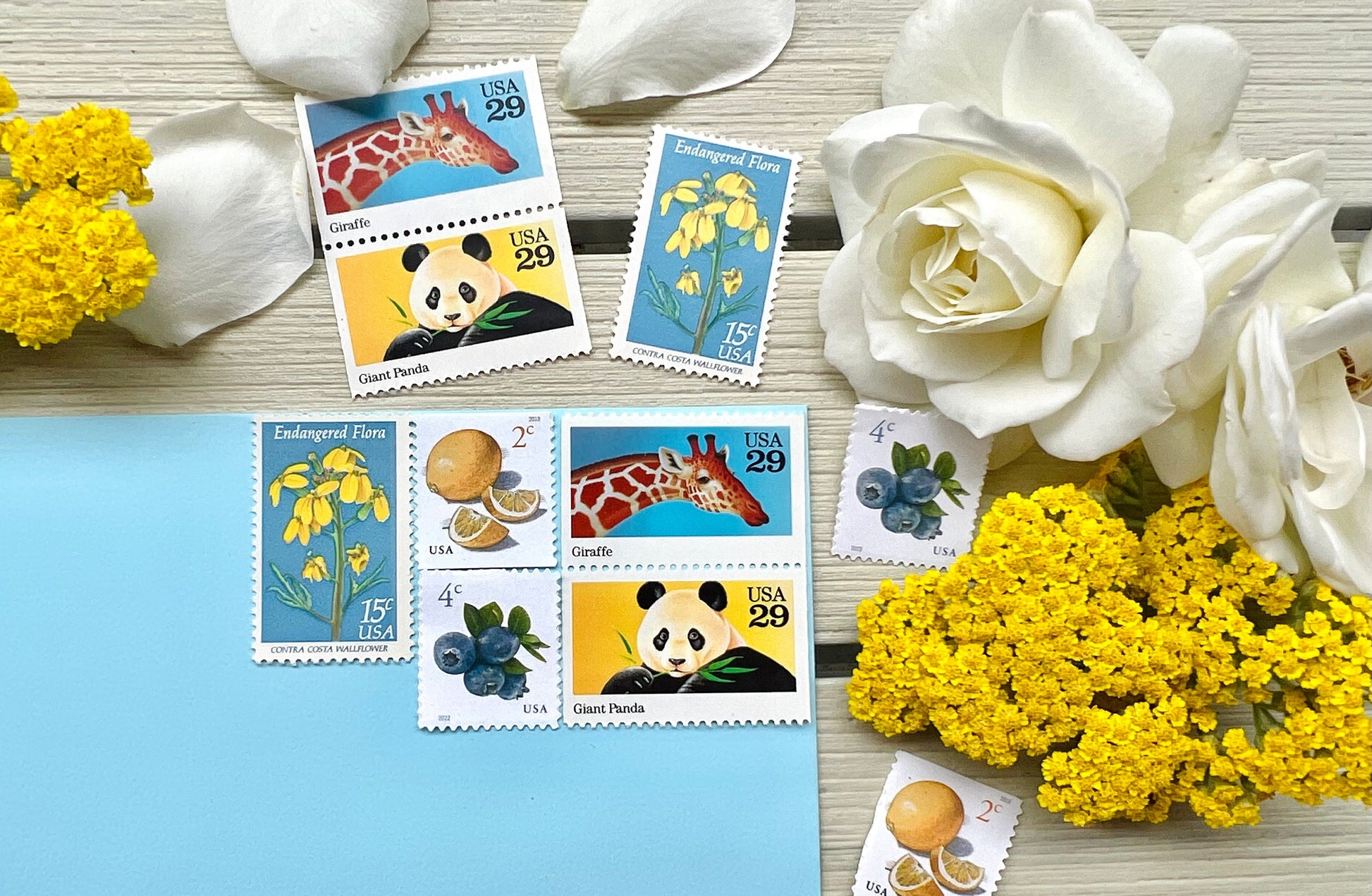 This listing includes enough stamps for 10 envelopes. Each envelope set includes 5 stamps for a total of 50 out of print + vintage USPS postage stamps.