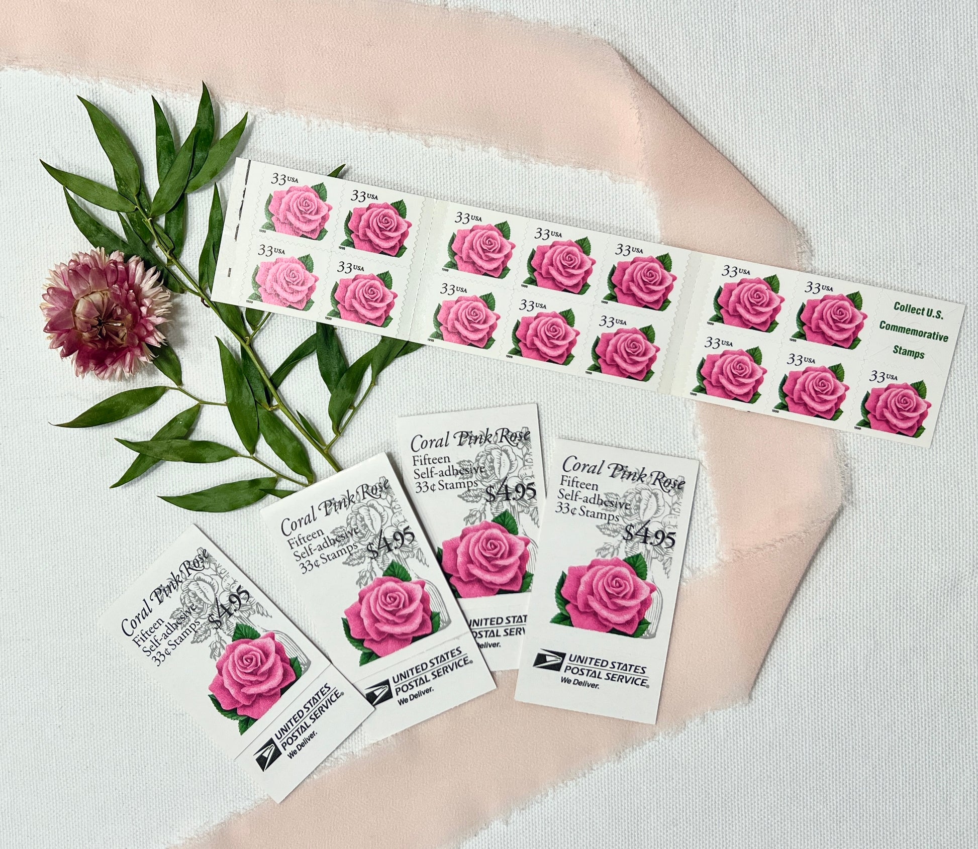This listing is for a vintage booklet of 15 pink coral rose USPS stamps from 1998. Each stamp has a face value of 33 cents.