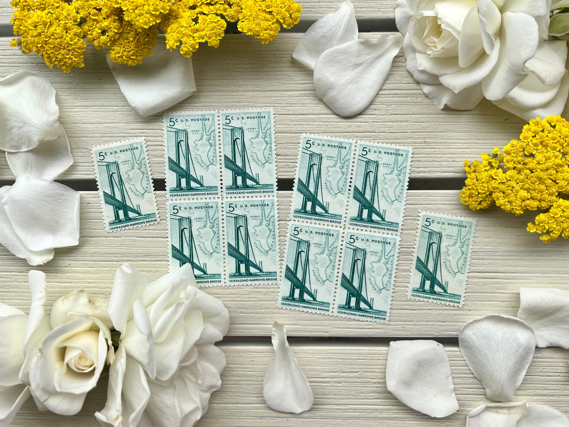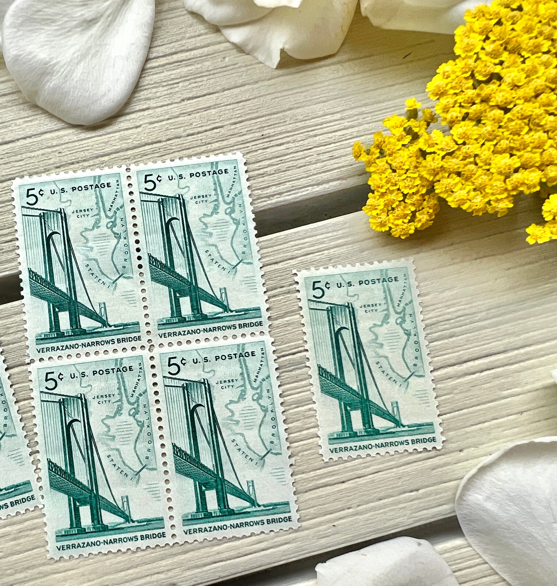 This listing is for a block of 4 or a pair of vintage New York - Verrazano-Narrows Bridge stamps. Each stamp has a face value of 5 cents.
