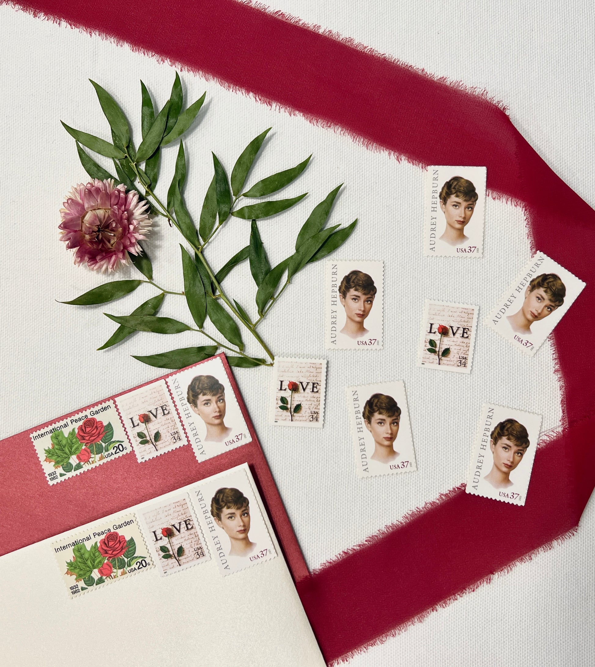 Neutral Wedding Postage - Floral Vintage Curated Set with Audrey Hepburn, International Peace Garden, Love Letter and Rose