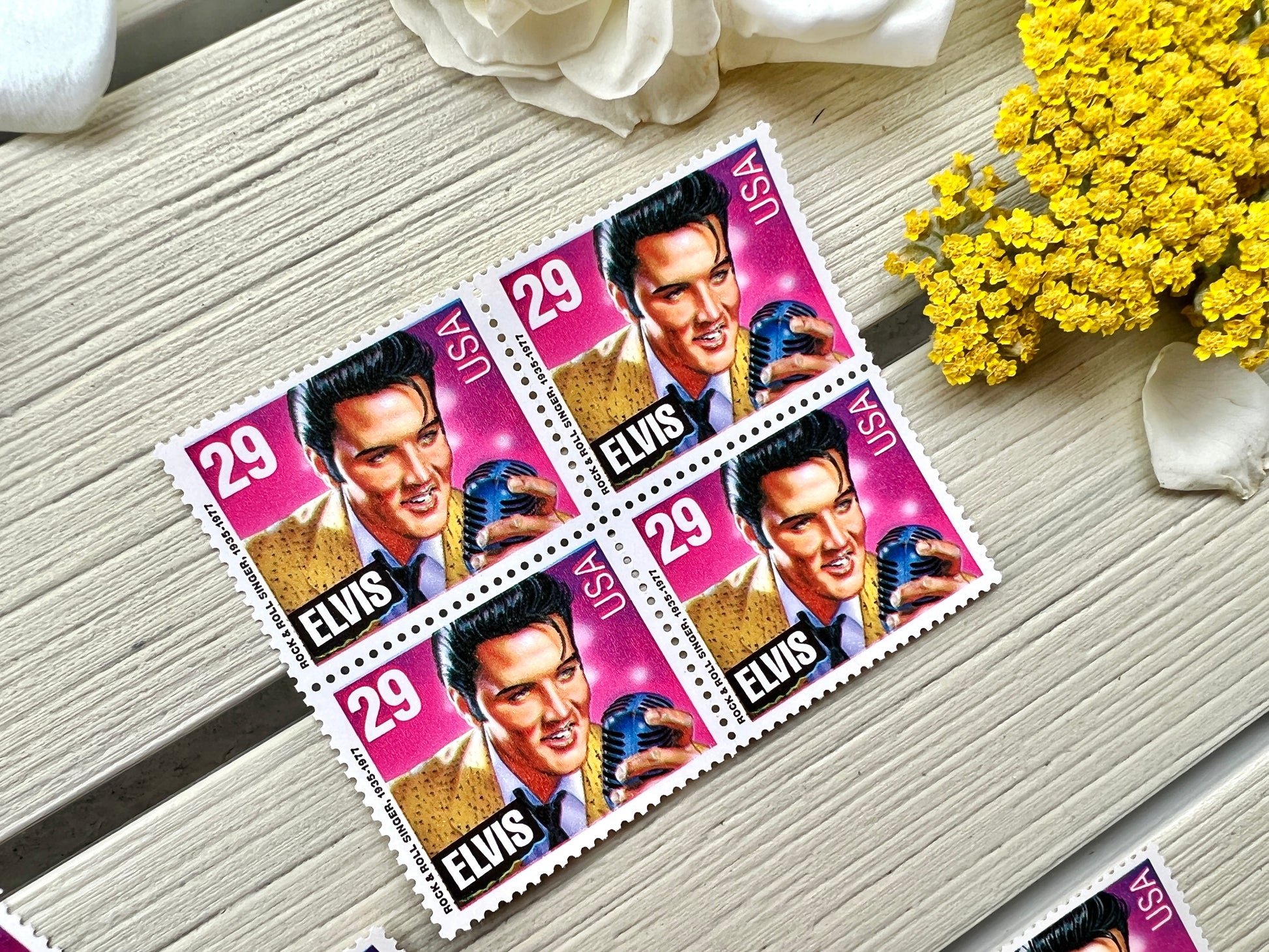 This listing is for a block of 4 vintage Elvis Stamps. Issued by USPS in 1993, these stamps have a face value of 29 cents each.