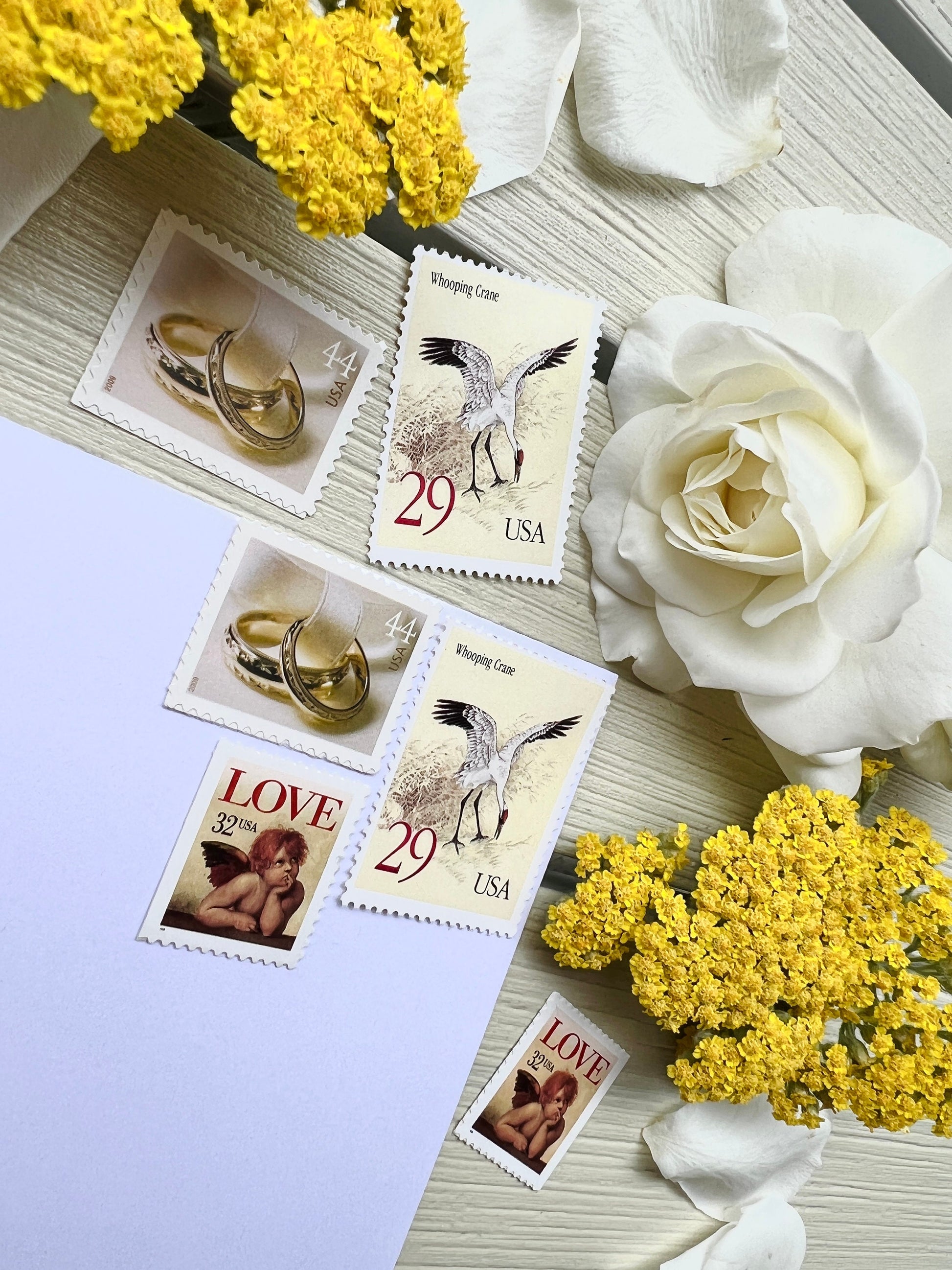This listing includes enough stamps for 5 envelopes. Each envelope set includes 3 stamps for a total of 15 out of print + vintage USPS postage stamps.