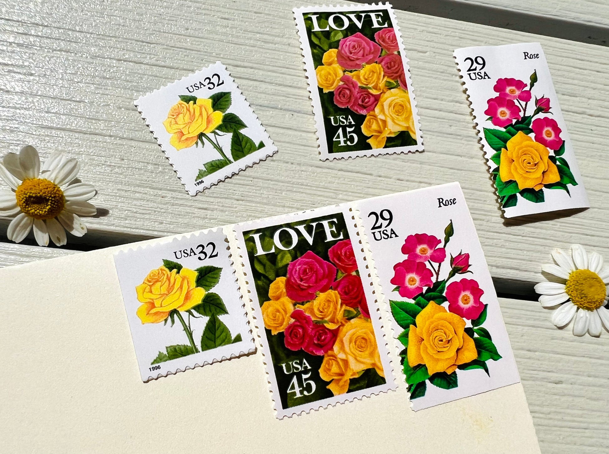This set includes enough stamps for mailing 5 envelopes. Each envelope set includes 3 stamps for a total of 15 vintage USPS postage stamps.