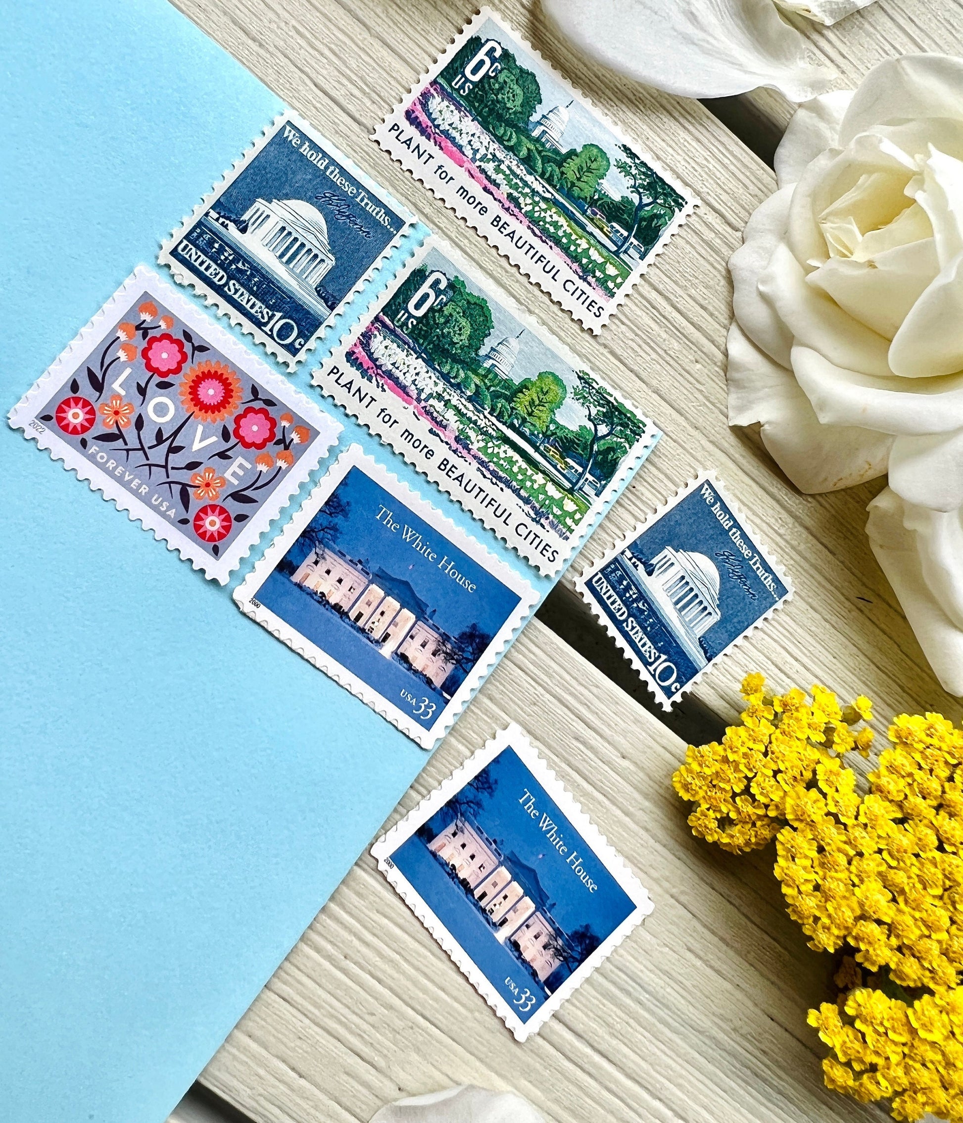 Washington DC Postage Stamp Set - Curated Blue and Teal USPS Stamps for 8 Envelopes - White House & Capitol Stamps for Mailing
